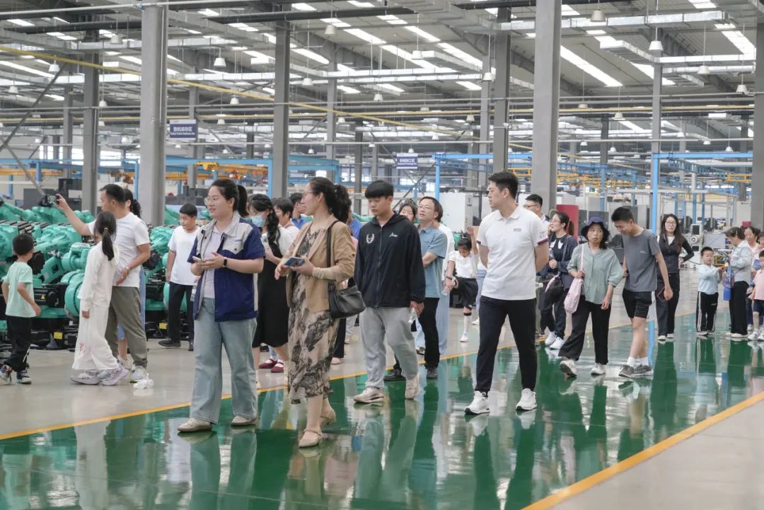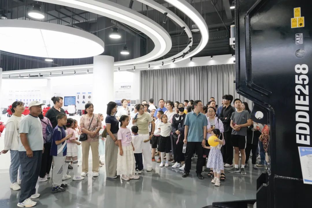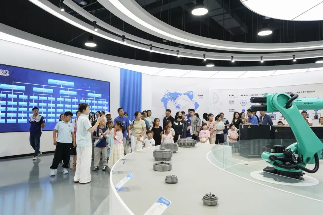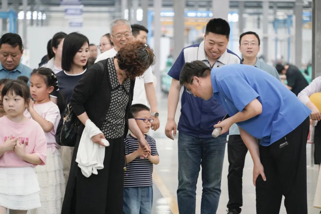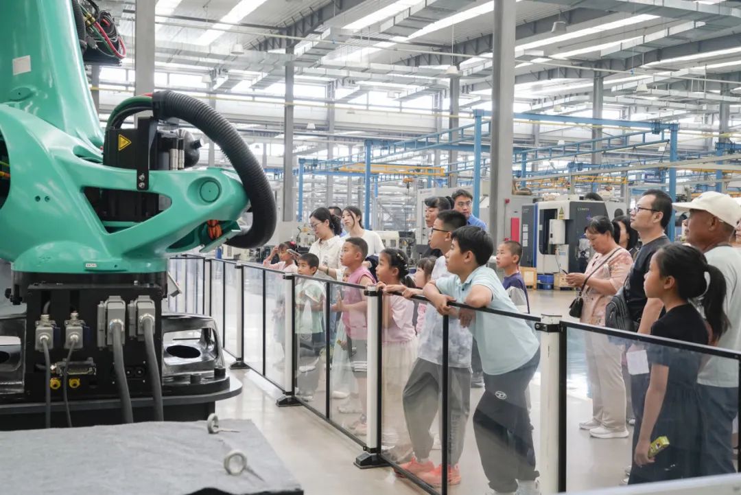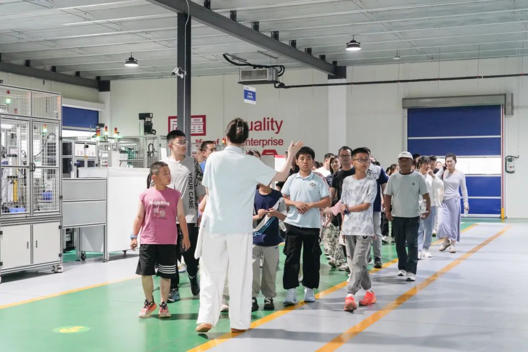 随后,家属们一同乘坐班车前往厂区参观,一场充满科技感的探秘之旅正式开启。在讲解员引领下,家属们依次走进智能化展厅、马达工厂与机器人工厂,近距离感受先进生产设备与精湛工艺。孩子们对自动化生产线充满好奇,不时发出惊叹声。这不仅是一次知识科普,更增进了家属对家人工作的理解与认同。